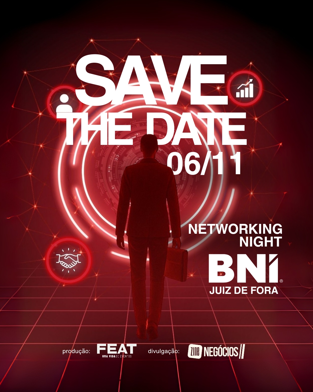 No dia 06/11, às 18h30, no Espaço Sirena, membros do BNI e empresários convidados se reúnem para uma noite de conexões estratégicas, palestras inspiradoras e muita experiência compartilhada.